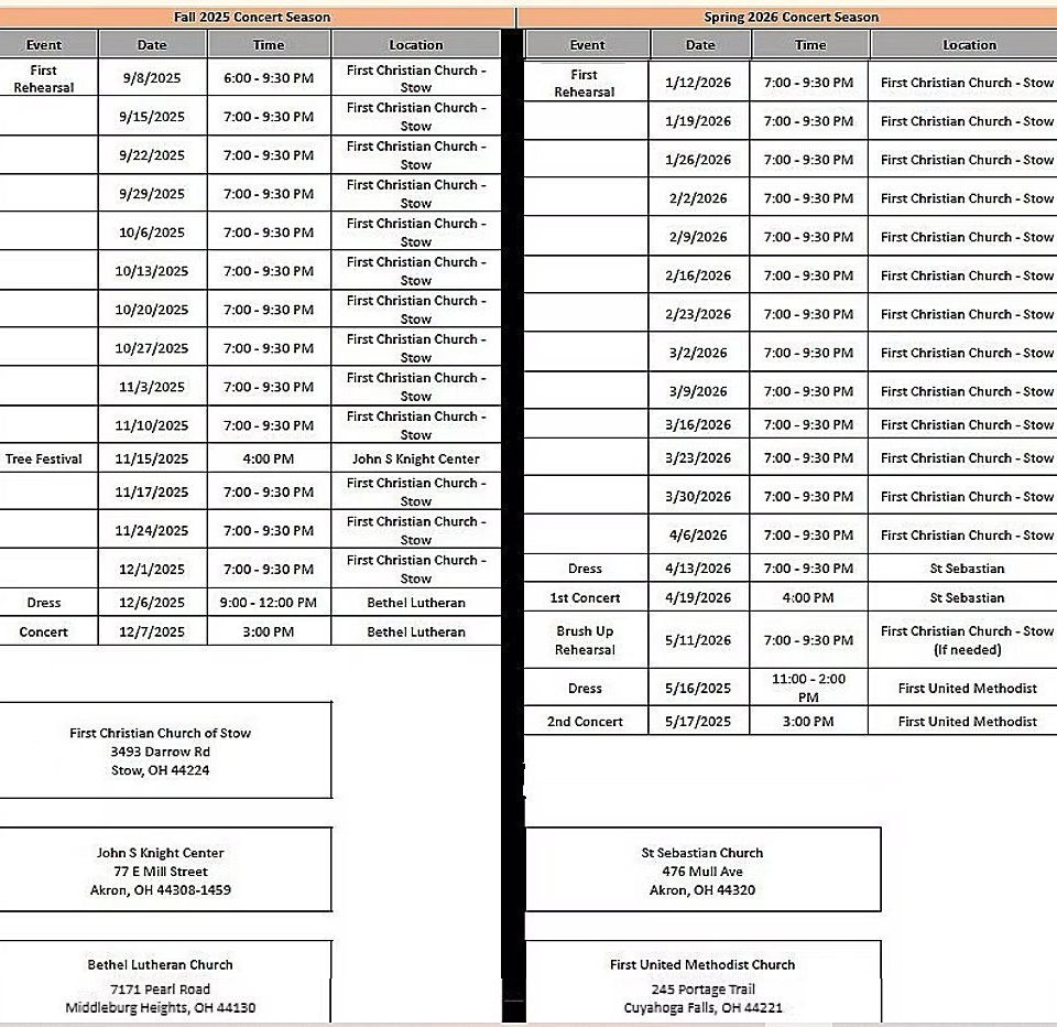 Dues for each performance season are $40. Dues are waived for high-school and undergraduate college students. Hardship arrangements can be made for those who wish to sing but find the dues to be difficult. Contact a Board member for information. Concert attire is required for the three performances and the Tree Festival. Details will be provided at rehearsal.